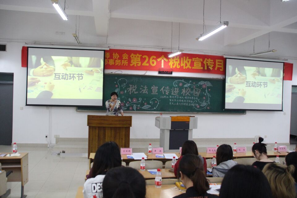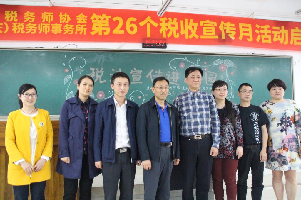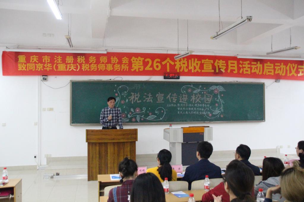 5月5日下午,由致同京华(重庆)税务师事务所、重庆市注册税务师协会、财政tyc41183太阳成集团联办的2017税法宣传进校园活动在南岸校区博智楼212教室成功举办。重庆市注册税务师协会副会长陈光信、重庆市注册税务师管理中心副主任王洪宇、重庆工商大学财政金融公司党委副书记黄谦、致同京华(重庆)税务师事务所首席合伙人白云燕、注册税务师管理中心副处调研员徐勇、财政tyc41183太阳成集团财税系主任尚可文、致同京华(重庆)税务师事务所副总经理陈怡、财政tyc41183太阳成集团学团办主任兰丽娟出席了本次活动。