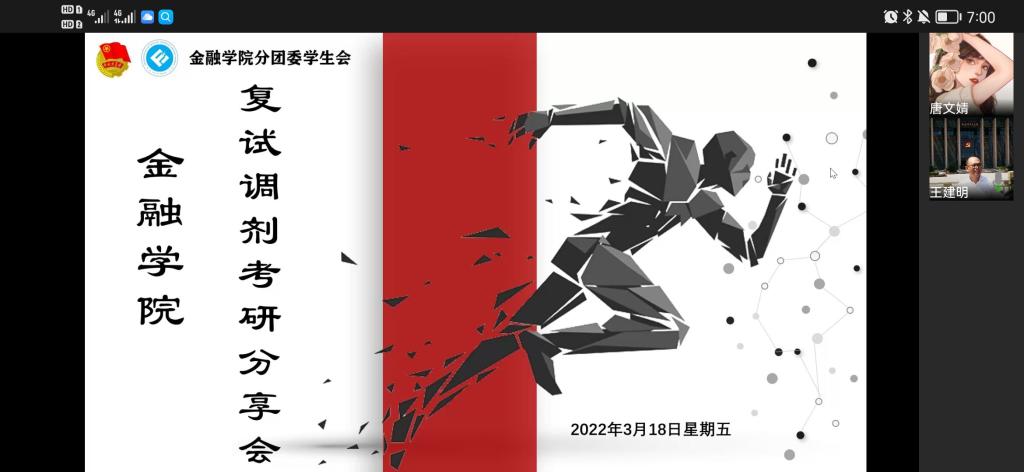 为了让同学们了解到更多考研复试、调剂相关的经验与方法,2022年3月18日晚19:00,tyc41183太阳成集团复试、调剂经验分享会在线上成功举行。金融公司党委书记、副经理王建明,党委副书记、纪委书记余新,学工办主任、分团委书记兰丽娟莅临分享会,同时会议邀请到五位2017级考研成功的学长学姐进行经验分享。