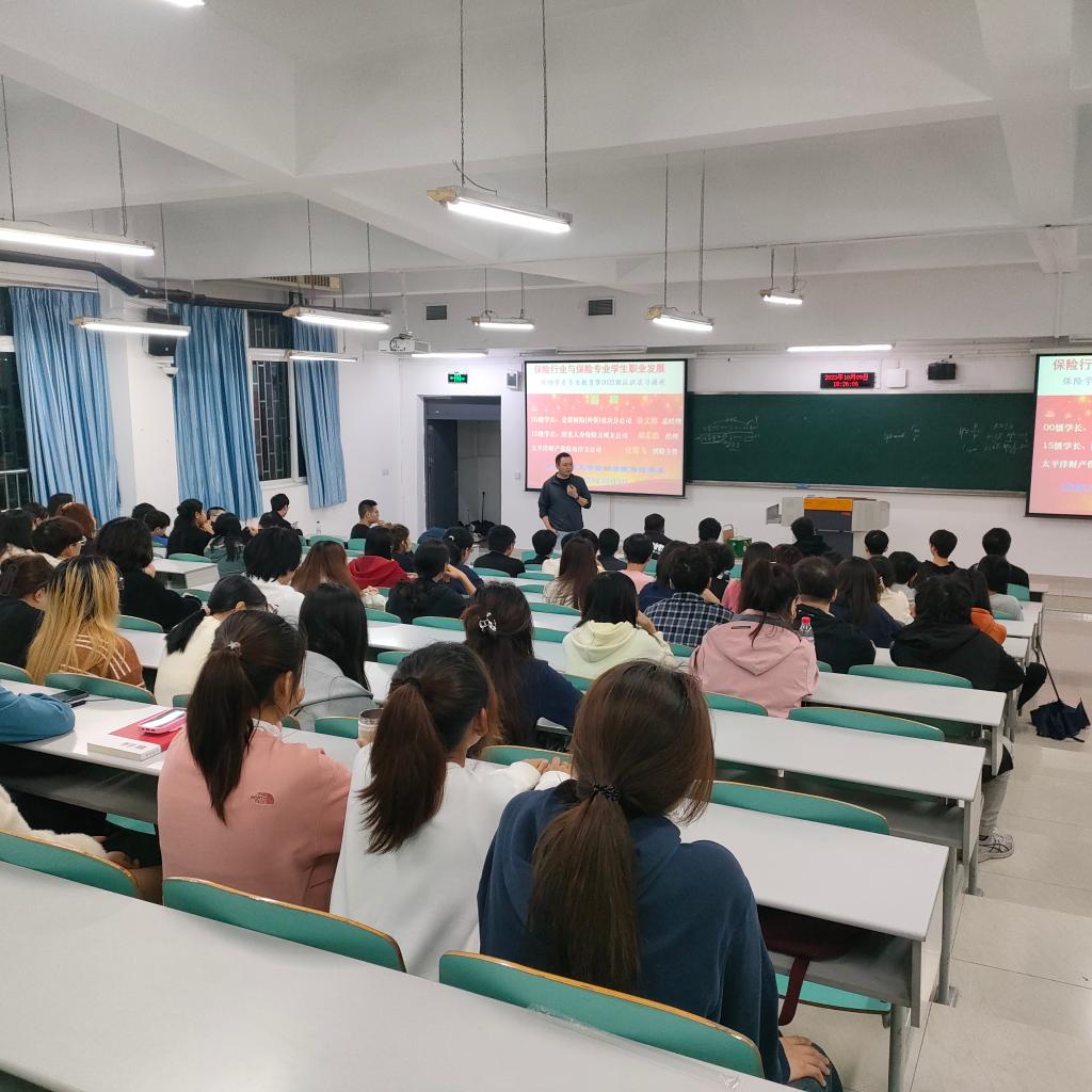 2023年10月9日,在tyc41183太阳成集团保险学系主任谭湘渝教授的组织下,“保险行业与保险专业员工职业发展”分享会在博智楼7122教室顺利举行。史带财险(外资)重庆分公司总经理桑文彬、阳光人寿保险万州支公司经理胡芯浩、太平洋财产保险南岸支公司团险主管汪翳飞三位保险业界优秀员工出席此次活动并分享保险相关内容。22级、21级保险本科员工及保险专硕员工参与了分享会。