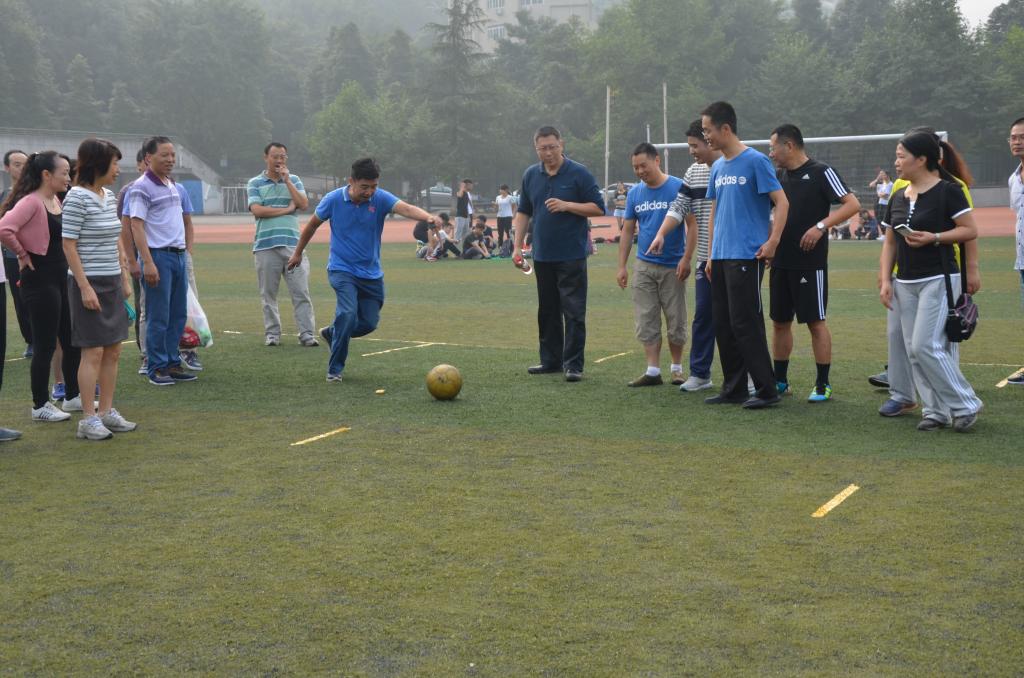 最后进行的项目是足球颠球+键子接力。各代表队派出男女教师各三名,男老师和女老师都可参与到足球颠球接力和踢毽子接力,除手以外的身体任何部位均可触球或毽子,并且接力成功的才计入总成绩,时间为两分钟,最终成绩以颠球与踢毽子的总数多者获胜。在这个项目里我们发现了好多“明星”,有的是颠球明星,有的是踢毽子明星;特别是个别男老师毽子踢得很好,个别女老师像踢毽子一样的去颠球也是不错的。本项目的第一名获得者是金融代表队。