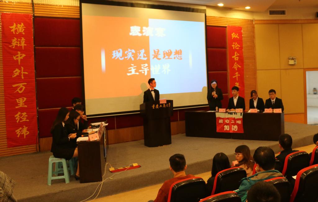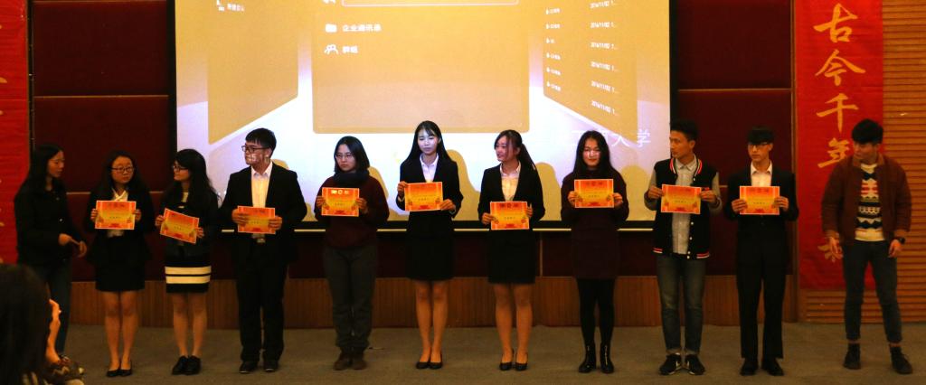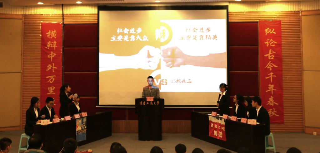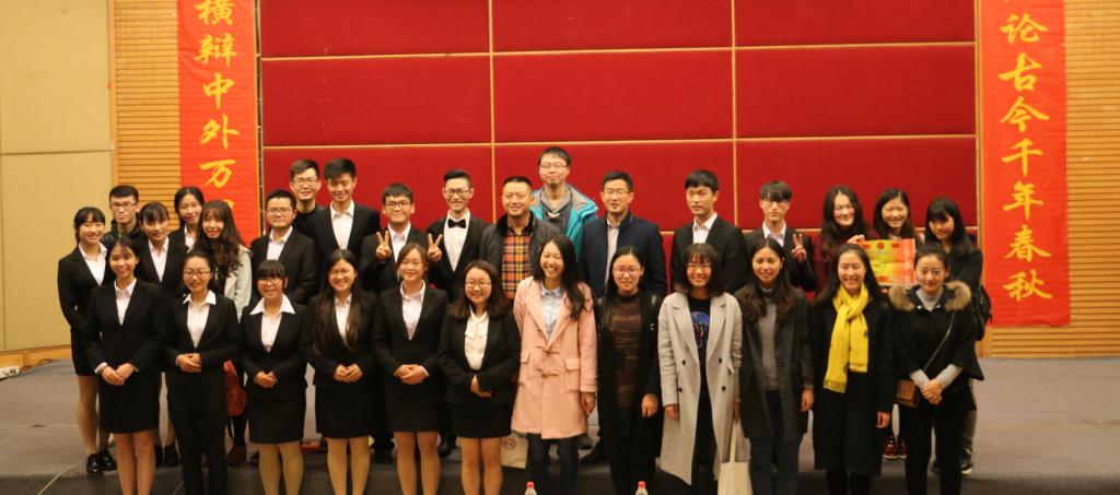 此次辩论赛决赛共分为立论、盘问、驳论、攻辩、自由辩论以及总结陈词六个环节。经过正反双方成员简洁的自我介绍后,双方就本次辩题——“社会进步主要靠大众还是靠精英”展开激烈辩论。辩手们在各环节中思路清晰,逻辑严密,引经据典,字字珠玑。其中,双方选手就“改革开放带来的社会进步究竟是由邓小平等精英推动还是由人民群众的实践检验推动”这一问题展开深入分析与辩论,一度将比赛推向高潮。在双方四辩总结陈词后,整场比赛告一段落,评委离席打分。接下来,财金辩论队为大家上演了一场精彩绝伦的表演赛,赢得阵阵掌声。接着由员工会副主席庞世强学长对本次比赛进行点评,徐阔老师对本次活动进行总结。最终,由主持人宣布比赛结果,反方队伍15级税收二班荣获第十五届“财金杯”辩论赛冠军,正方队伍16级CFA获得亚军,正方四辩徐晓获得本次比赛“最佳辩手”称号。获奖选手与之前已经决出的季军15级金融四班代表队、15级金融五班代表队和多位优秀辩手共同参加颁奖仪式,并与老师们一起合影留念。