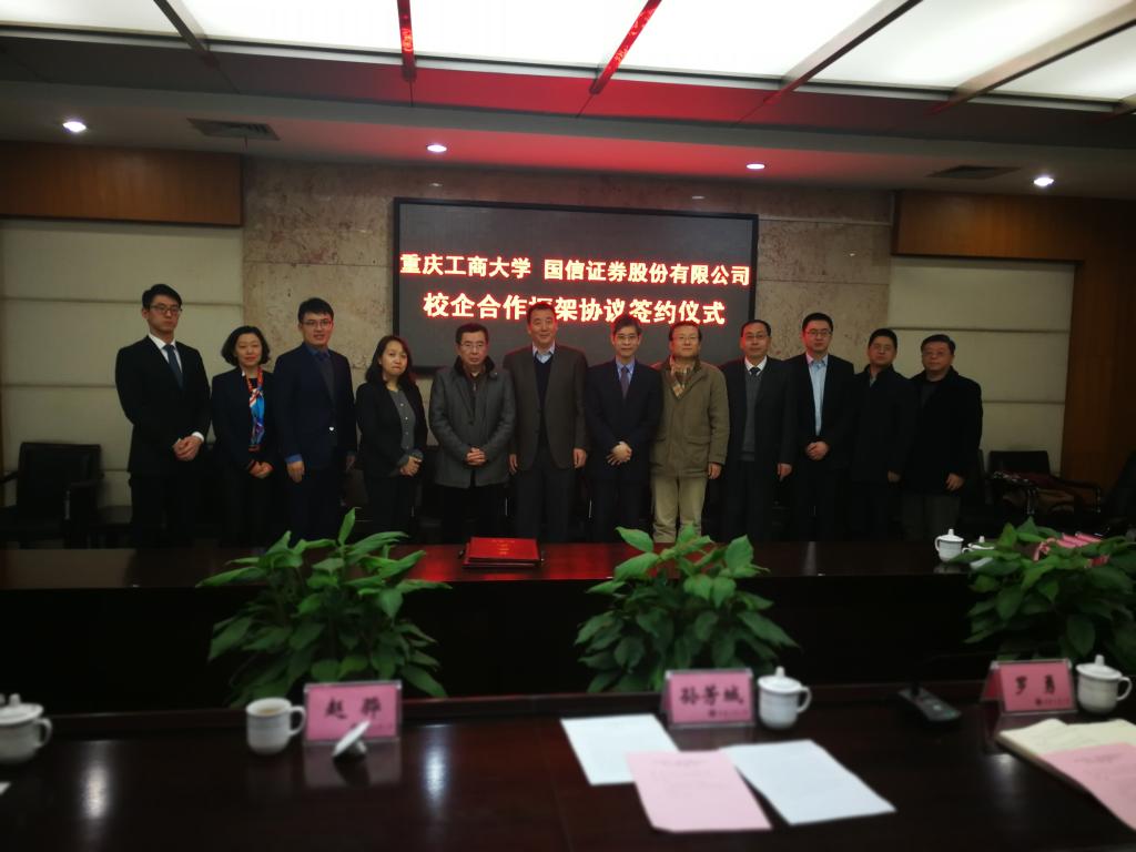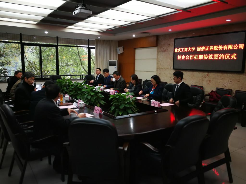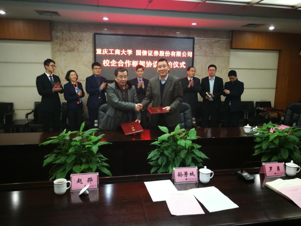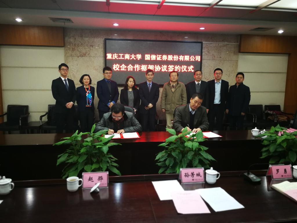 1月18日下午,为加快贯彻落实《重庆市以大数据智能化为引领的创新驱动发展战略行动计划(2018-2020年)》等文件精神,重庆工商大学与国信证券股份有限公司在厚德楼3019会议室签订战略合作协议。国信证券股份有限公司副总裁徐敬耀、投研总监陈俊杰、重庆分公司总经理高莉、总经理助理李颖、业管部负责人陈哲,公司董事长孙芳城教授、副董事长赵骅教授、党政办、教务处以及财政tyc41183太阳成集团主要负责人出席了签约仪式。仪式由公司党政办主任罗勇教授主持。