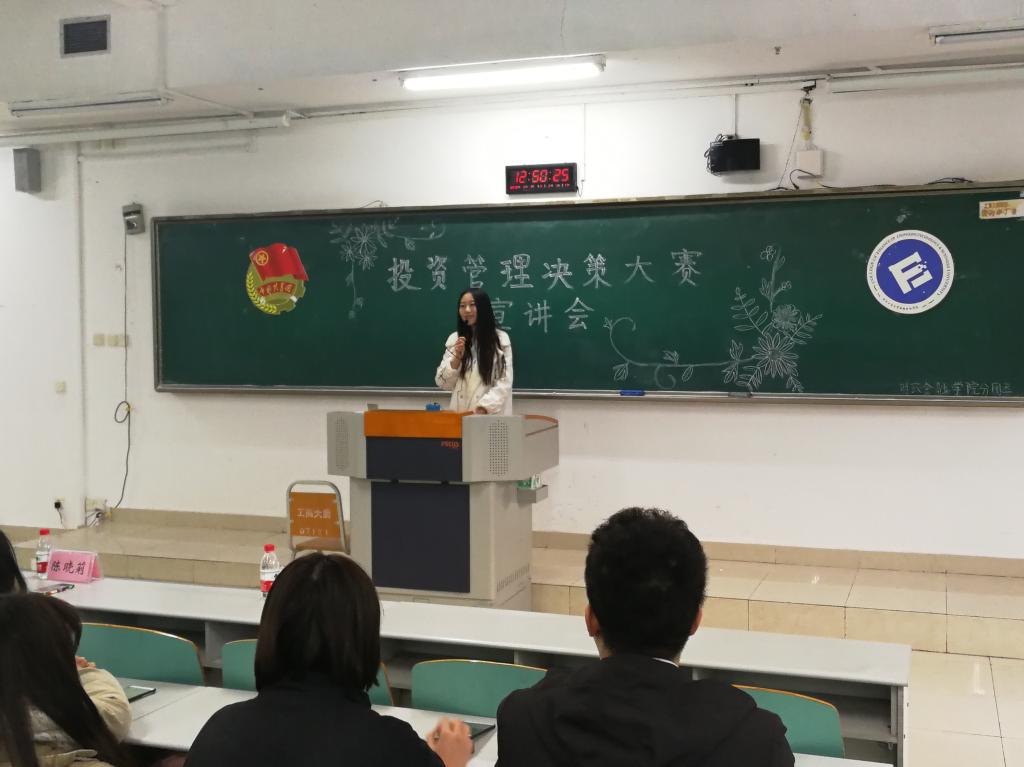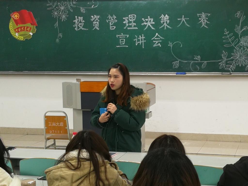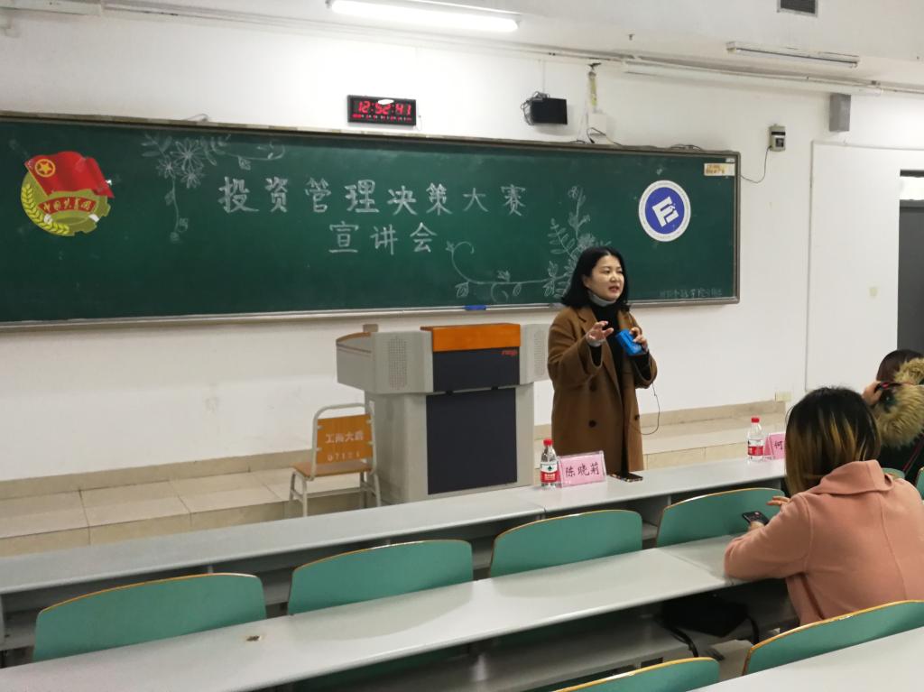 3月7日中午12:50,重庆工商大学第十七届“新儒商”老员工科技文化节之投资管理决策大赛宣讲会在博智楼07121教室举行。财政tyc41183太阳成集团投资系陈晓莉老师以及往届优秀选手何欣悦同学出席本场宣讲会。