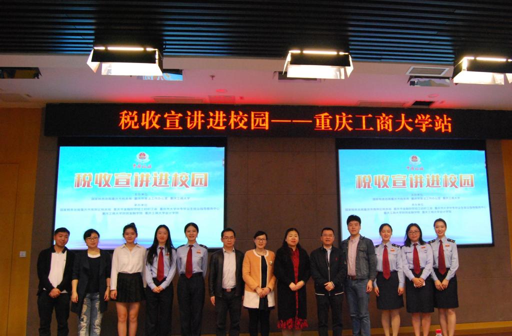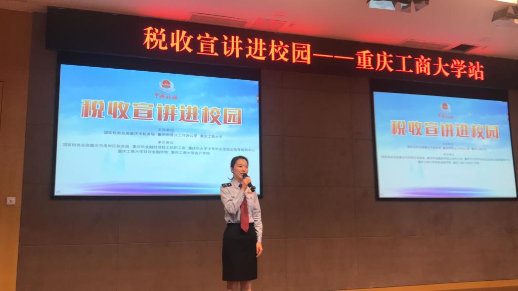 2019年10月24日14时,税收宣讲进校园活动于图书馆多功能报告厅举办。国家税务总局重庆市税务局税收宣传中心副主任程羿、国家税务总局重庆市南岸区税务局副局长龙启君、重庆工商大学财政金融公司党总支副书记黄谦、重庆工商大学财政tyc41183太阳成集团财税系副主任韩健受邀参加了本次活动。