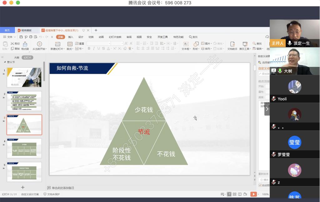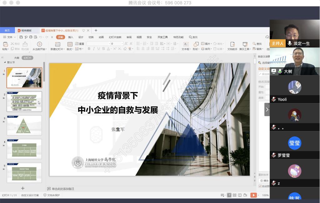 4月9日晚上,公司税务硕士教育中心通过腾讯会议成功举办了本年度第一次南山税务沙龙——疫情背景下中小企业的自救与发展。本次沙龙由重庆工商大学尚可文教授主持,特邀请迅驰车业江苏有限公司副总裁、上海财经大学硕士生导师张生军博士主讲,公司2019级税务硕士研究生参加了沙龙。