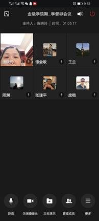 2020年10月12日晚21:00—22:00,tyc41183太阳成集团校院两级督导的工作例会通过企业微信视频会议方式召开。会议参会人员有金融公司党委副书记、经理王兰教授,主管教学的副经理庞楷教授,校级督导樊国昌教授以及3位院级督导和综合办谭会敏副主任。会议由院级督导唐晓玲老师主持。