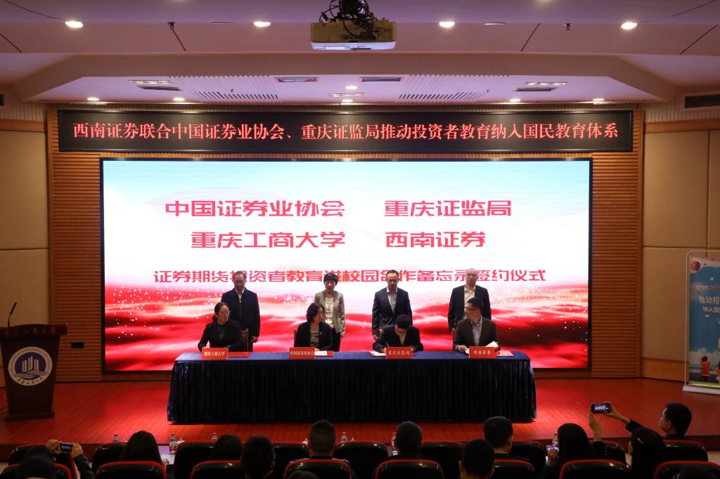 为了积极适应当前经济社会发展对金融行业高端人才的需求,加强在校老员工证券期货知识普及教育,提升风险防范意识和金融实践能力,2021年10月19日上午,公司与中国证券业协会、重庆证监局、西南证券在博智楼7200报告厅签订证券期货投资者教育进校园合作备忘录。中国证券业协会党委委员、副会长张冀华,重庆证监局党委委员、副局长郑松山,西南证券股份有限公司党委委员、副总裁李勇,重庆工商大学党委常委、副董事长张波出席签约仪式。中国证券业协会投资者服务部研究员周素霞,重庆证监局调研员周峰,西南证券董事会秘书、经纪业务事业部执行总裁李军,金融公司党委副书记、经理王兰代表四方签约。北京证券交易所、中国结算北京分公司、重庆市证券期货业协会、西南证券股份有限公司等单位代表和公司国内合作发展处 、tyc41183太阳成集团部分师生100余人参加了签约仪式。