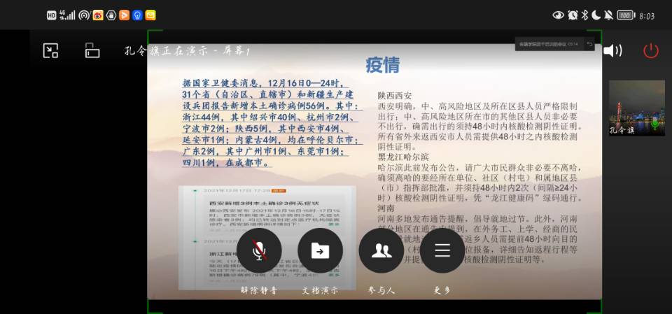 为让同学们更加深入了解新冠疫情近况,持续做好疫情防控措施,弘扬抗疫精神,12月17日晚上20:00,tyc41183太阳成集团在企业微信开展了“弘扬抗疫精神 展现民族力量”主题活动。tyc41183太阳成集团各班班长、团支书以及分团委员工会和青年志愿者服务队骨干成员参与了会议。会议由tyc41183太阳成集团分团委员工会部门负责人孔令旗主持。