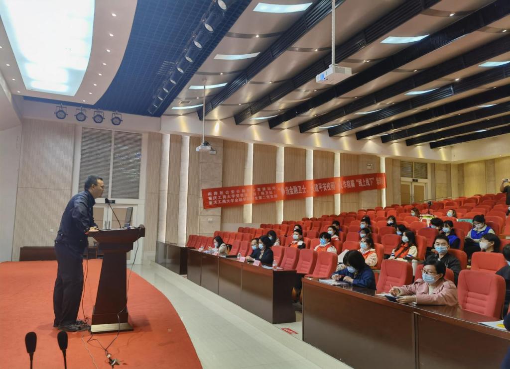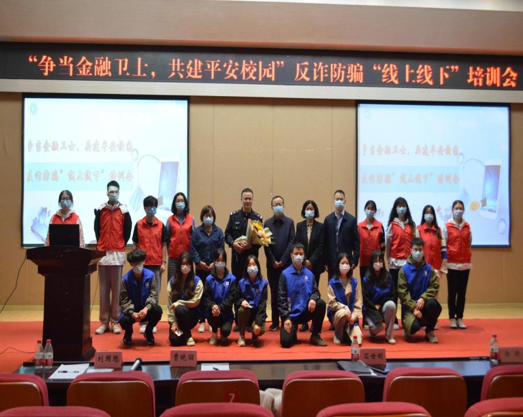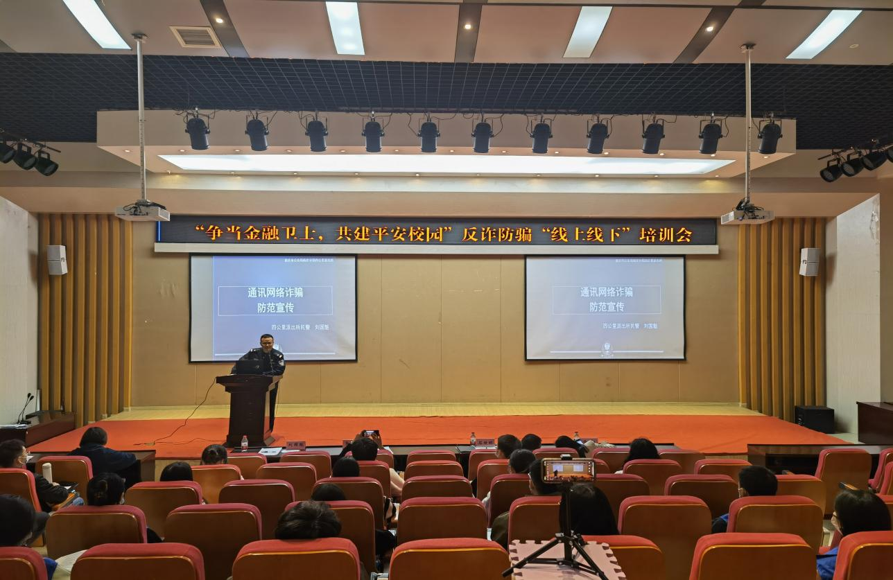 2022年10月28日,为普及防范诈骗知识,进一步提升员工的反诈防骗能力,南岸区公安分局四公里派出所、重庆工商大学党委保卫部(保卫处)以及tyc41183太阳成集团在田家炳209报告厅联合举行“争当金融卫士,共建平安校园”反诈防骗“线上线下”培训会。重庆市南岸分局四公里派出所警官刘国魁,公司党委保卫部副部长(保卫处副处长)曹晓丽,金融公司党委书记、副经理石世明,金融公司党委副书记、纪委书记余新,金融公司党委委员、专职组织员赵甫刚及全体辅导员老师出席了培训会。“金融卫士”团队及员工第二党支部(双创)代表参加了现场培训,其他同学同步线上观看直播。