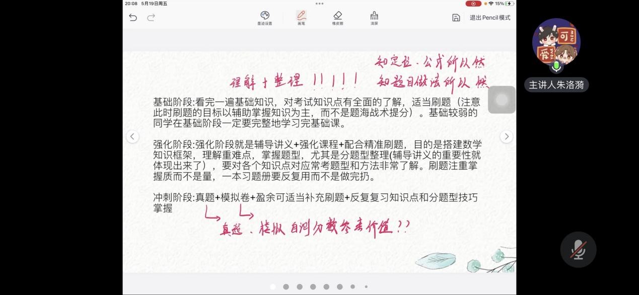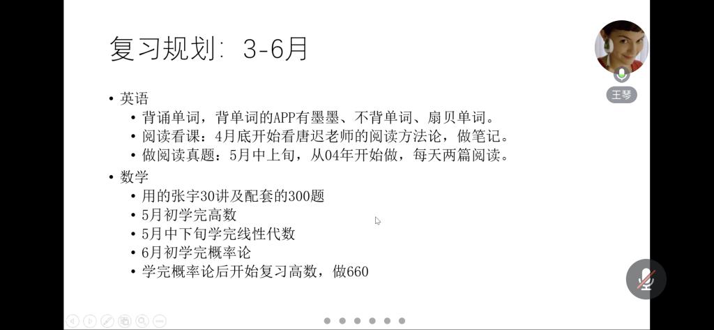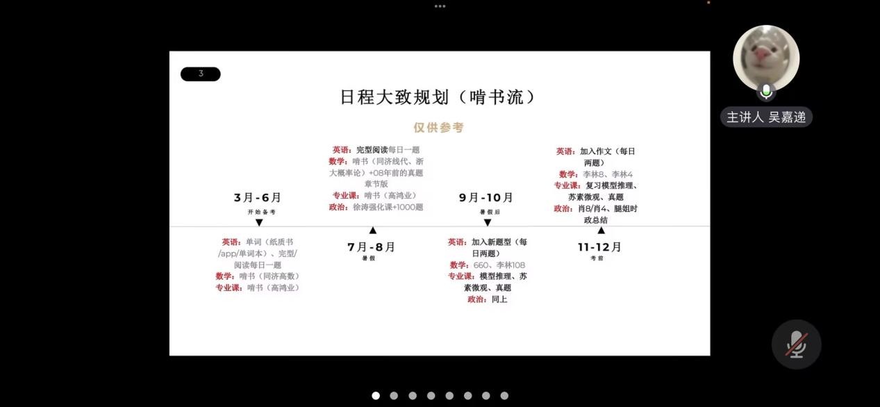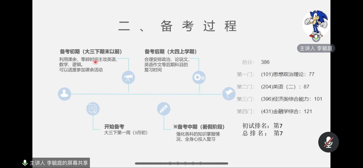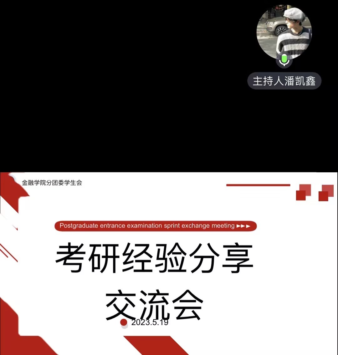 19金融数学朱洛漪(西南财经大学 金融学专硕)结合自身经验,向大家讲述了自己当时考研的过程。她通过对西南财经大学复试录取率的分析,鼓励大家做好考研规划,保持清醒的头脑,规划好时间以及及时关注平台上的考研信息,打破信息差。同时,她对每一科目都提出了复习建议以及推荐了复习资料。她表示考研备考的关键就是要保持好心态,只有成功坚持到最后的人才能取得胜利。