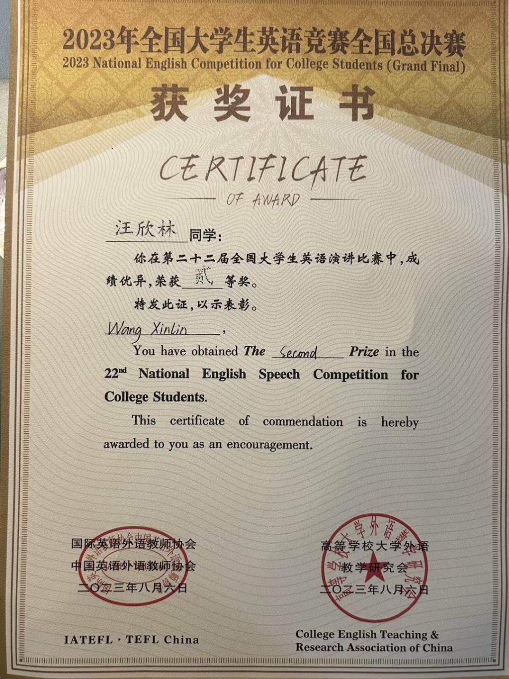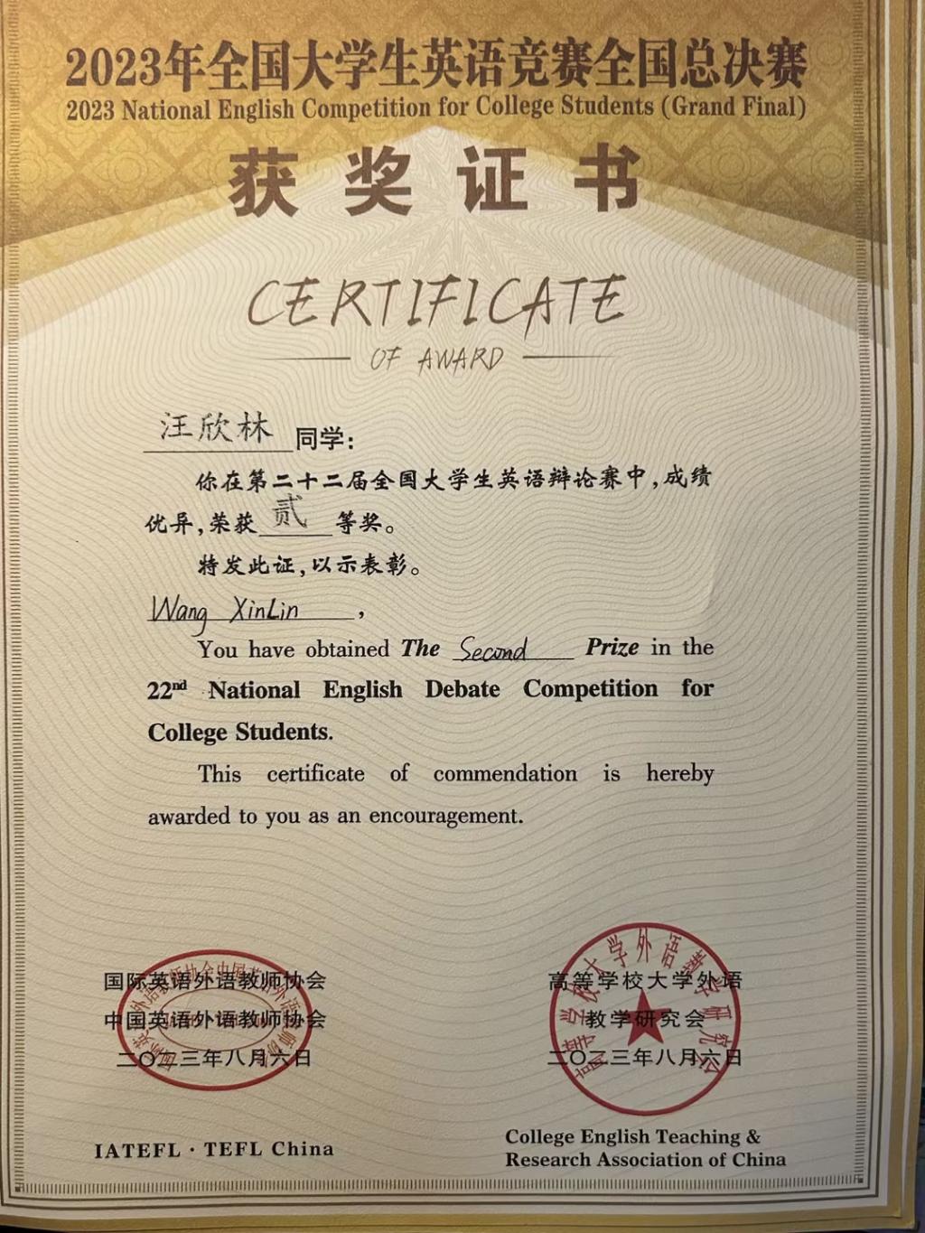 2023年8月3日下午14时,第二十二届全国老员工英语演讲比赛预赛开赛!全体参赛选手按照参赛类别分为11个分赛场进行参赛。参赛选手可在组委会上午公布的英语演讲备选题目中任选其一进行3分钟的英文演讲,演讲完毕由专家评委提问打分得出成绩。8月4日上午,第二十二届全国老员工英语演讲比赛决赛拉开帷幕,来自全国各高校的120名入围选手分成两个会场,按照抽签顺序提前5分钟抽签获得演讲题目,并上台进行3分钟即兴英语演讲,演讲题目丰富多彩,选手们妙语连珠。最终汪欣林同学荣获二等奖。