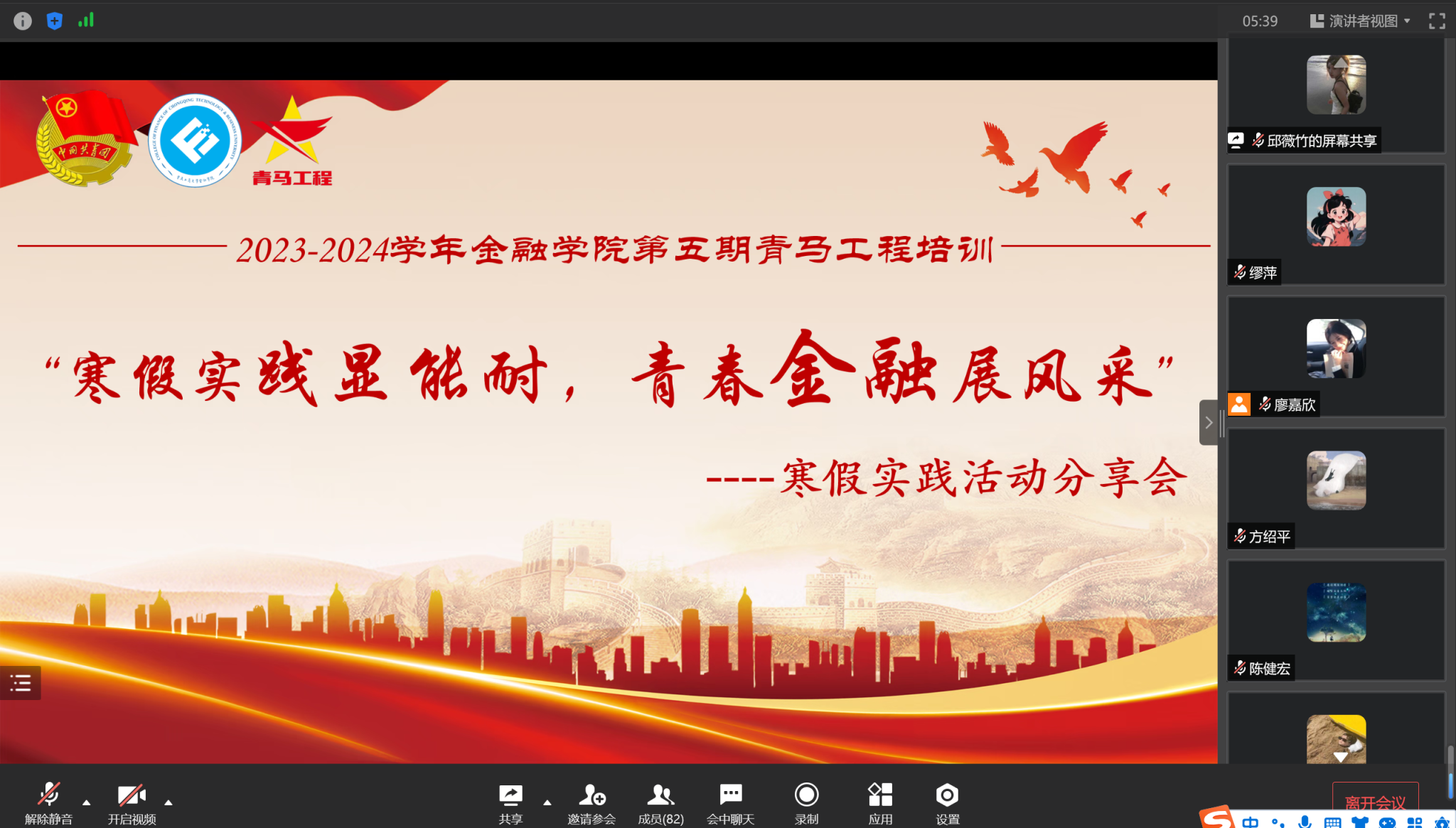 此次分享充分体现了青马培训的教育意义和实践意义,展现了金融学子的青春风采。同时通过不同的实践活动让大家看到了实践的魅力和价值,也激励了大家在学习之余走出教室,探索自我价值和实践魅力。
