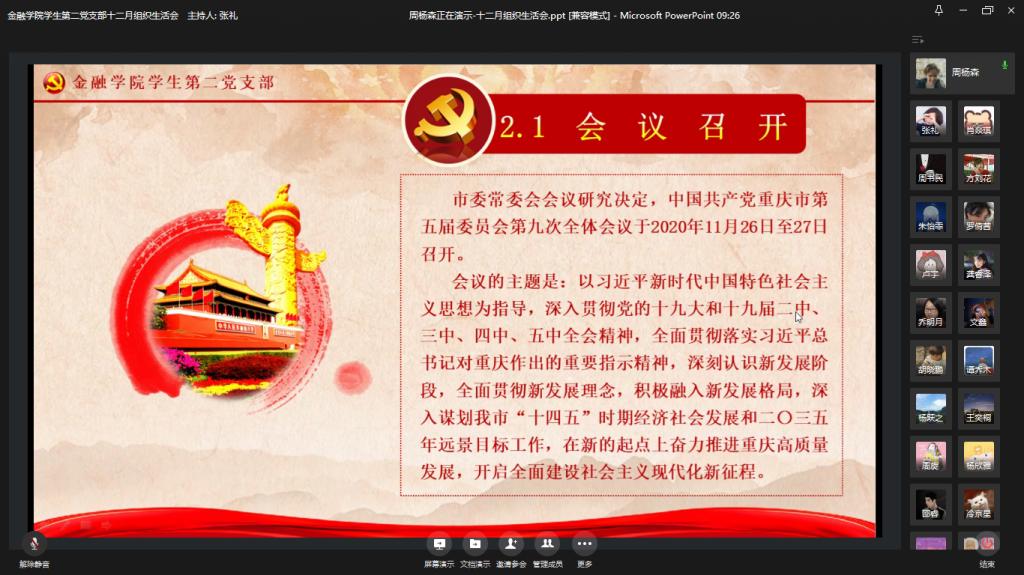 首先,由周杨森同志领学十九届五中全会精神、中共重庆市委五届九次全会精神、《深化新时代教育评价改革总体方案》、习近平总书记近期重要讲话、《党章》专题学习。周杨森指出,党的十九届五中全会,是我们党在全面建成小康社会胜利在望、全面建设社会主义现代化国家新征程即将开启的重要历史时刻召开的次十分重要的会议。会议不仅提出了“十四五"规划,还提出了到2035年基本实现社会主义现代化远景目标。