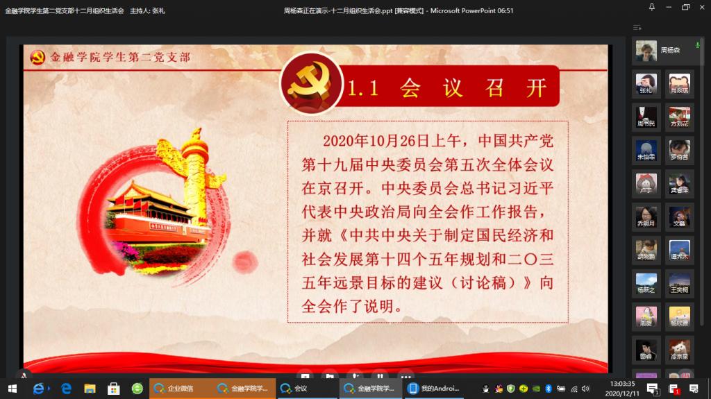 为全面贯彻落实党的十九届五中全会精神,进一步加强党员同志们的政治思想觉悟,tyc41183太阳成集团员工第二党支部于2020年12月11日在企业微信举行了十二月组织生活会。出席本次大会的成员有tyc41183太阳成集团员工第二支部书记乔明月老师和支部全体党员同志。本次会议主要由党员同志领学新精神、分享心得体会和总结发言三个环节构成。