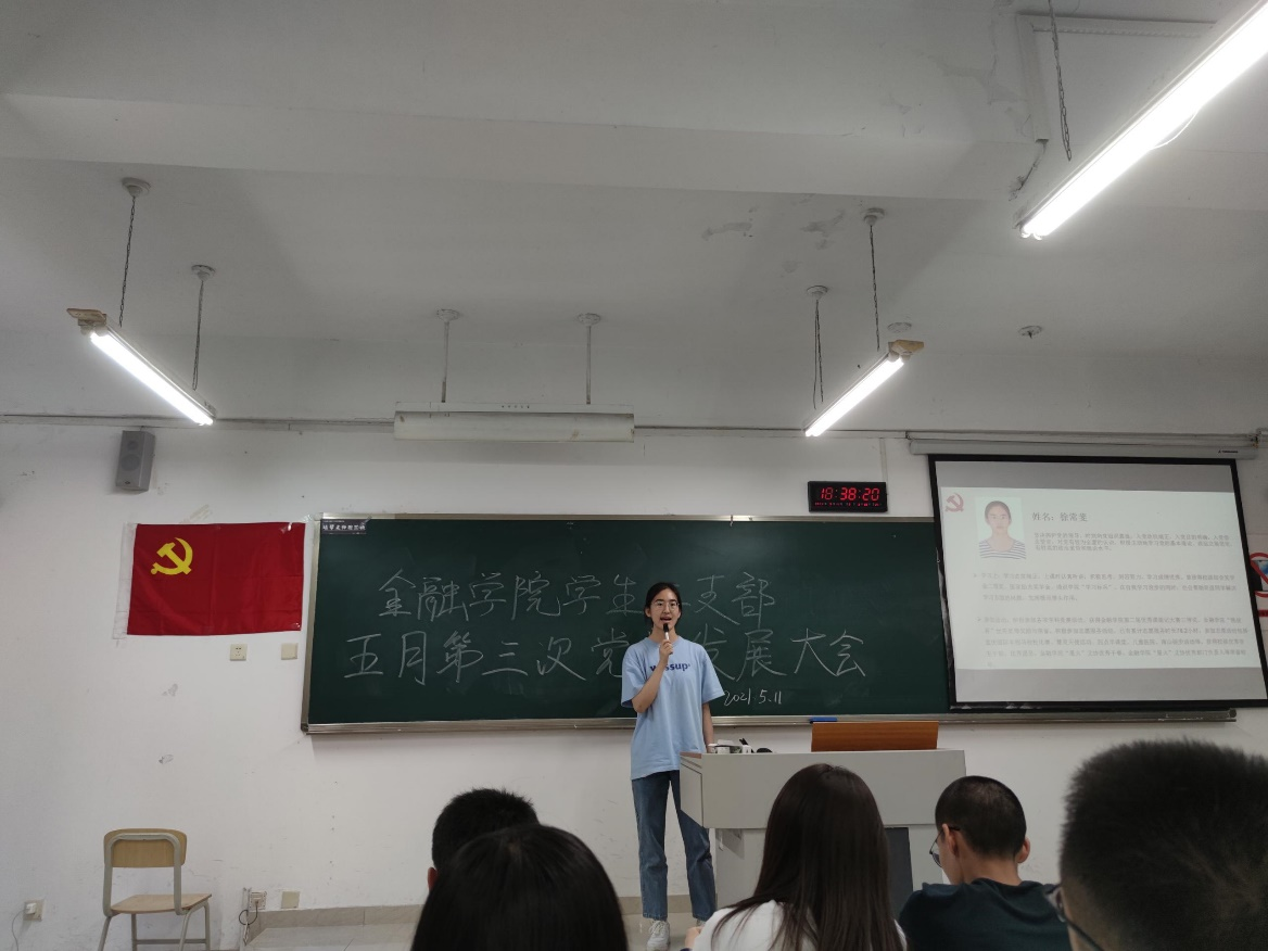 会议正式开始,并严格按照以下流程进行党员发展:首先,发展对象在讲台上从思想、学习、参加活动等多个方面介绍自己的个人情况及入党动机;接着,由该发展对象的入党介绍人介绍该同志的实际情况,在给予一定的肯定的同时也提出了对该同志未来的期望;接下来由陶瑜同志发起投票,支部正式党员对该发展对象是否能够成为预备党员进行表决;最后,发展对象对最终的发展结果发表自己的感言。