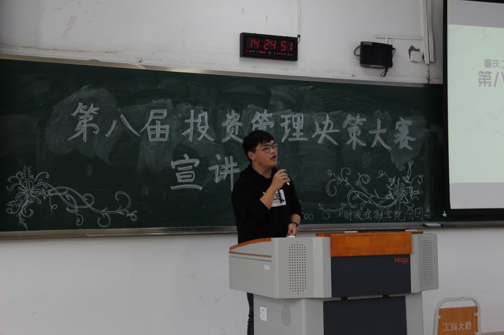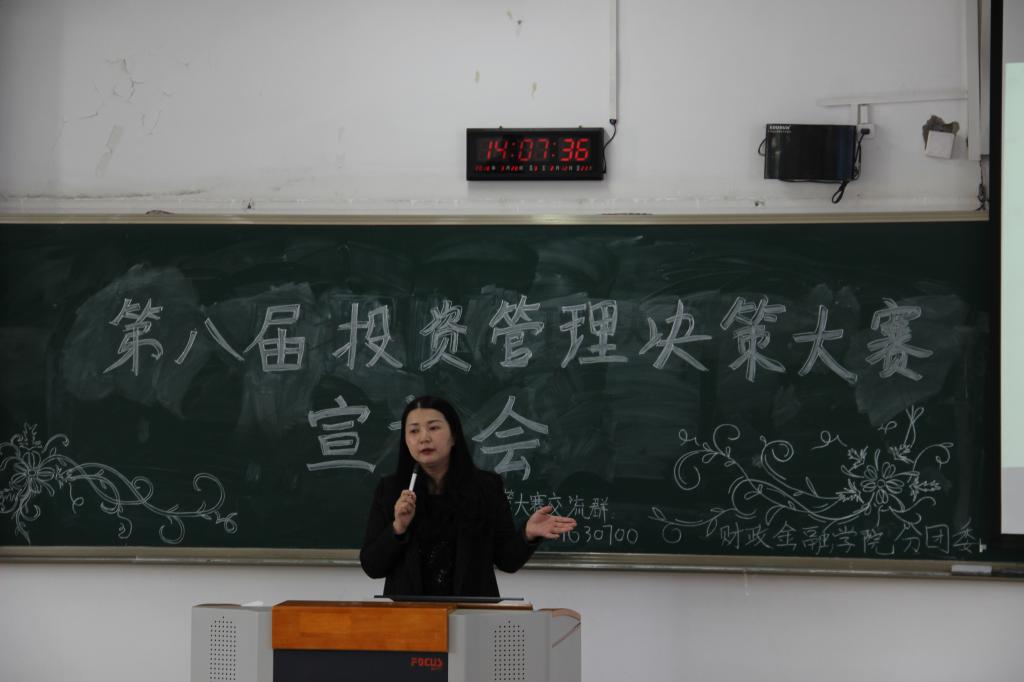 为响应“大众创业,万众创新”的号召,财政tyc41183太阳成集团以校团委“第十六届‘新儒商’老员工科技文化节”活动为依托,于2018年3月16日下午两点在博智楼308成功举办了第八届投资管理决策大赛宣讲会。本次宣讲会邀请到了投资系老师陈晓莉老师、财政tyc41183太阳成集团分团委书记徐阔老师以及财政学专业陈羲羲学长为同学们指导。