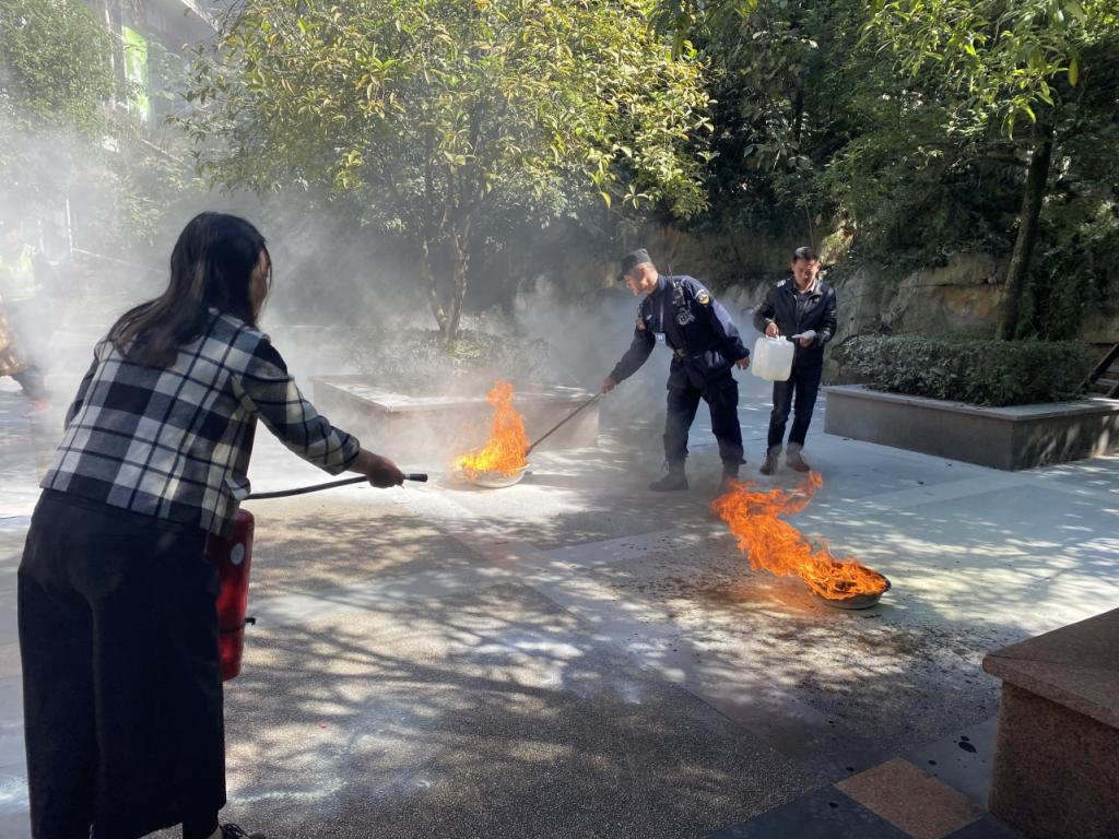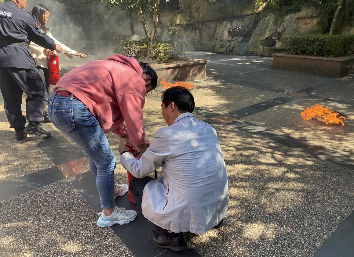 (图为员工和老师体验使用灭火器)