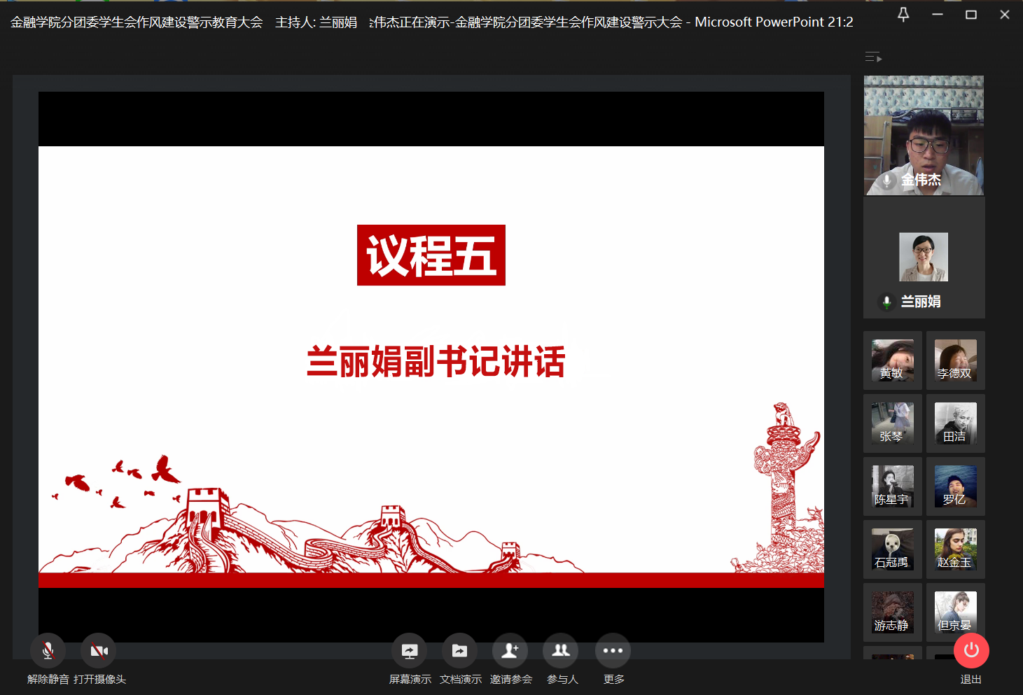 为加强员工干部作风建设,引导员工会和谐健康发展,2020年11月25日21:00,tyc41183太阳成集团分团委员工会于企业微信召开线上作风建设警示教育大会,学工办副主任、分团委副书记兰丽娟老师与员工会全体成员参与了本次大会。