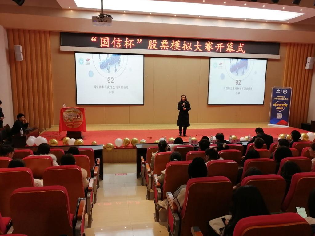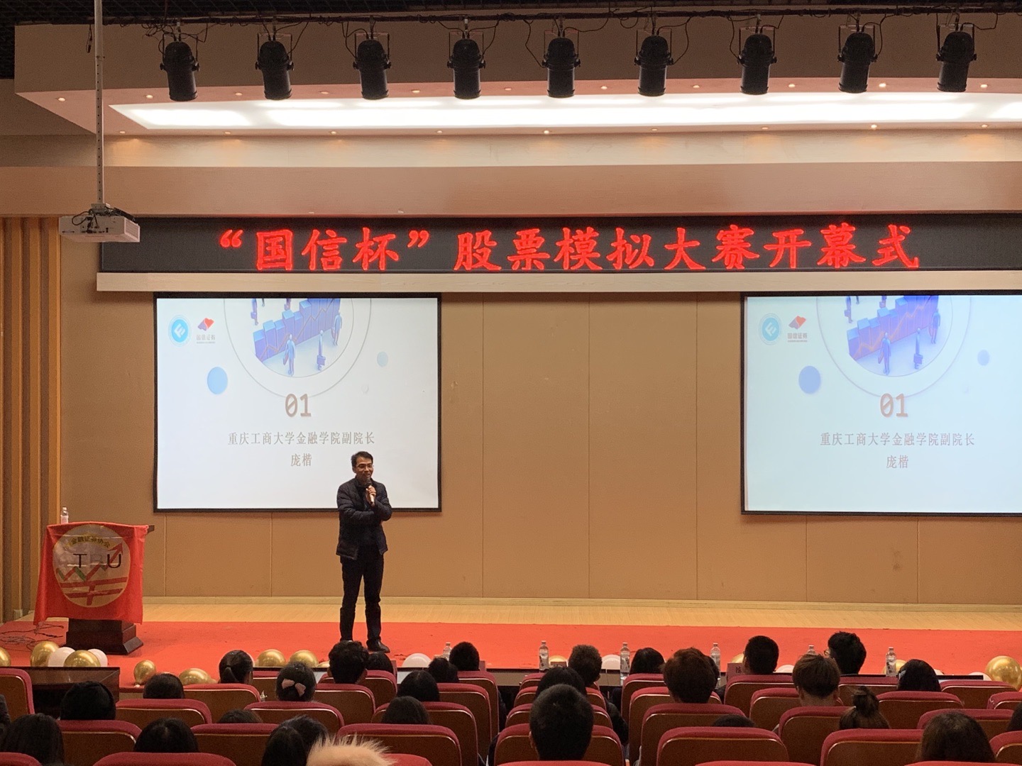 本次开幕式中,重庆工商大学tyc41183太阳成集团庞楷副经理,tyc41183太阳成集团投资系主任魏琪老师,国信证券重庆分公司副总经理李颖女士等嘉宾出席现场。期间,庞楷副经理、国信证券重庆分公司副总经理李颖女士进行致辞,表示了对开展“国信杯”股票模拟大赛由衷的支持和对参赛选手们的殷切期待。