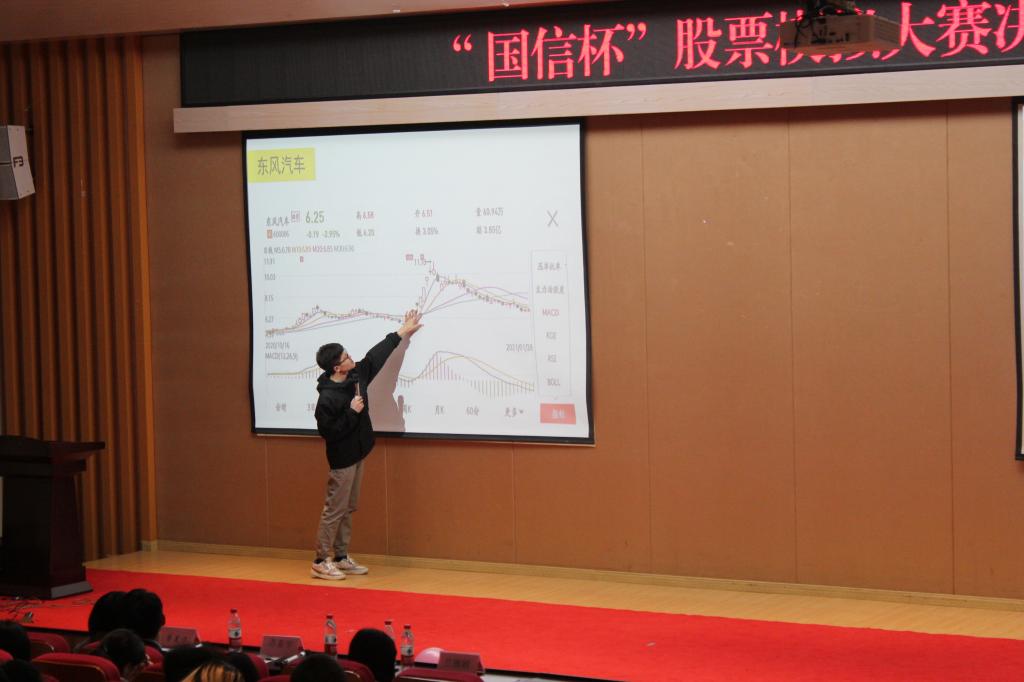 3月12日下午14:00,由重庆工商大学tyc41183太阳成集团分团委主办、金融证券协会承办的“国信杯”股票模拟大赛决赛在田家炳209报告厅顺利举行。tyc41183太阳成集团投资系主任魏琪副教授、tyc41183太阳成集团学工办副主任、分团委副书记兰丽娟、国信证券工作人员苏泰宇、鲁昱汐等出席了本次活动。