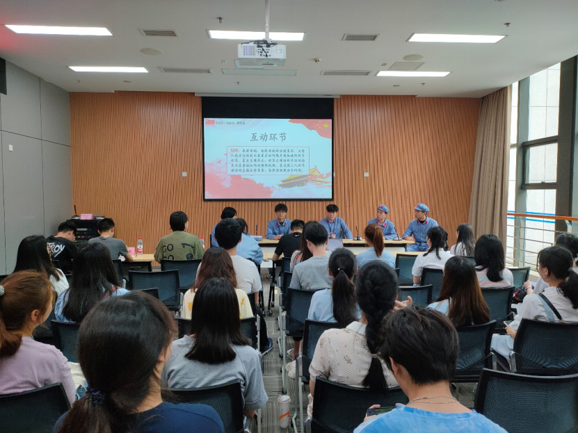 第一位主讲人田凯玉同学讲述建国以前,中国共产党的创立、党的七次全国代表大会、抗日战争的胜利、遵义会议的伟大转折等,最终迎来中华人民共和国成立。他号召同学们深刻理解和传承党的优良传统,艰苦奋斗、迎难而上,用积极的心态面对学习和生活。分享后,大家一起欣赏了话剧片段演出的第一幕,并就表演的相关内容与观众进行互动。