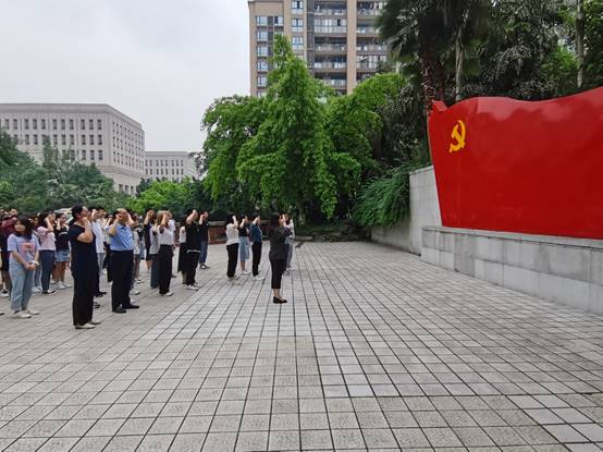 金融公司党委于5月21日在南岸主校区校前广场开展“党旗在基层一线高高飘扬”活动之新党员宣誓仪式。公司党委书记、副经理王建明同志、公司党委副书记、经理王兰、公司党委副书记、纪委书记余新同志、专职组织员赵甫刚、学团办副主任兰丽娟、员工一支部书记袁霄、员工三支部书记张燕、研究生一支部书记杨宁、研究生二支部书记余红霞、公司2021年新加入中国共产党的51名预备党员以及10名入党积极分子代表参加宣誓仪式。仪式由专职组织员赵甫刚主持。
