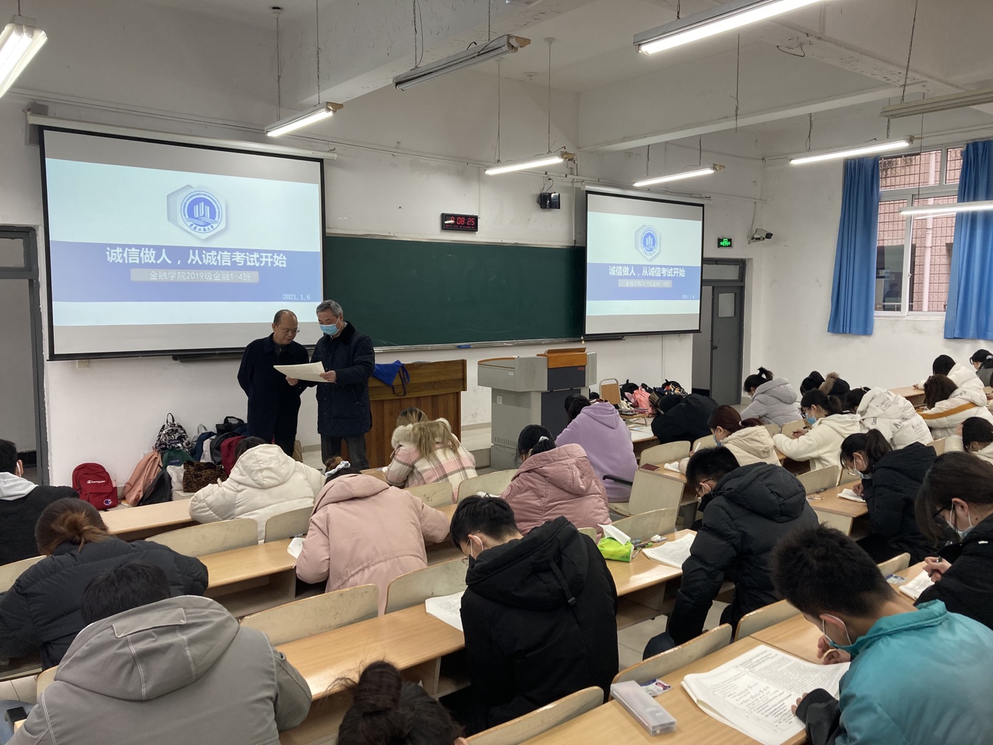 为培养具有“新儒商”精神的新时代老员工,践行“诚信做人,从诚信考试开始”的誓言,2021年1月6日tyc41183太阳成集团2019级金融学专业共计159名员工自愿申请在博智楼07207和07208教室举行《金融学》课程的“免监考”诚信考试,这是tyc41183太阳成集团首次举行的“免监考”诚信考试,副董事长李国军教授、董事长助理谭松涛教授前来巡考。