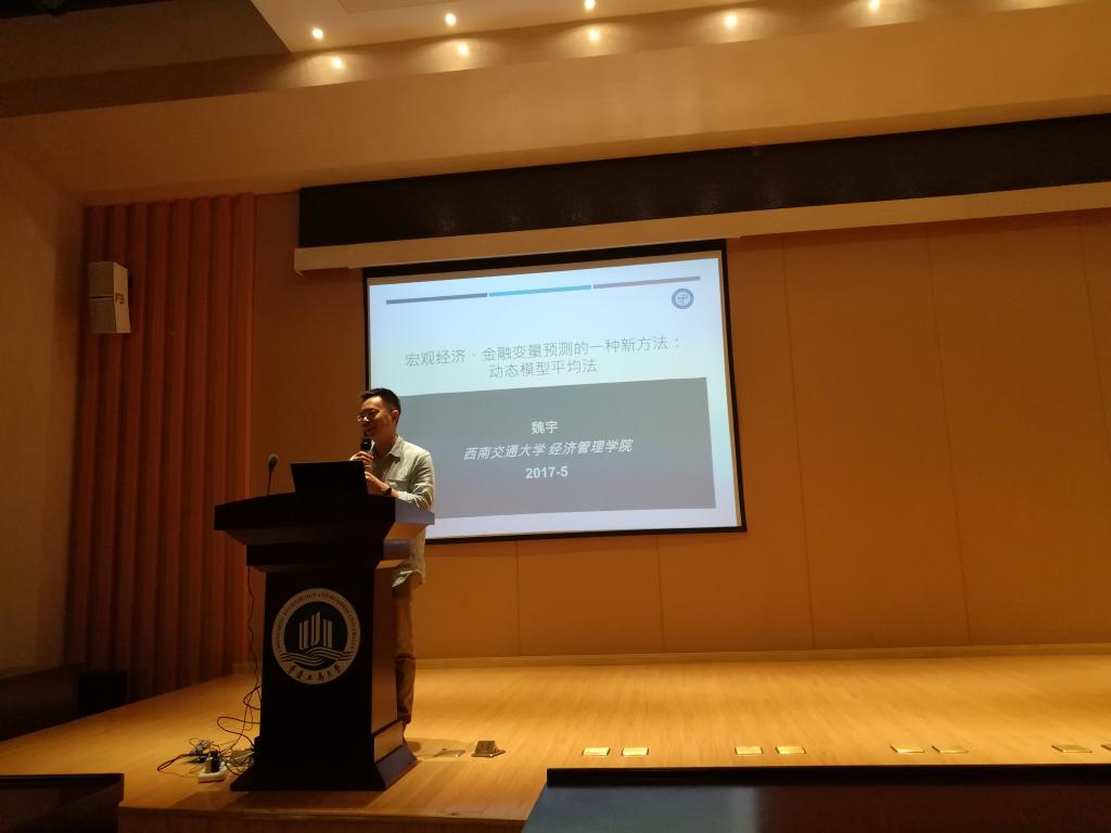 魏宇,博士、教授、博士生导师,西南交通大学经济管理公司金融与财务学系主任,是一位非常杰出的青年学者,是国内众多青年奖的获得者,计量模型研究专家,在这一领域取得了许多成果。本次讲座他介绍的是一种宏观经济变量预测的新方法,解决了传统模型的一些问题和缺陷。魏教授首先给同学们梳理了论文写作的要点和方法,然后对模型的讲解,并以房价作为研究对象进行实证举例,从原理到运用再到实证、结果解释每个方面都做了详细明确的说明。在讲解过程中,把数学模型用最简单有效的方式展现给同学们,通俗易懂,深入浅出,同学们都全神贯注地听取和记录。
