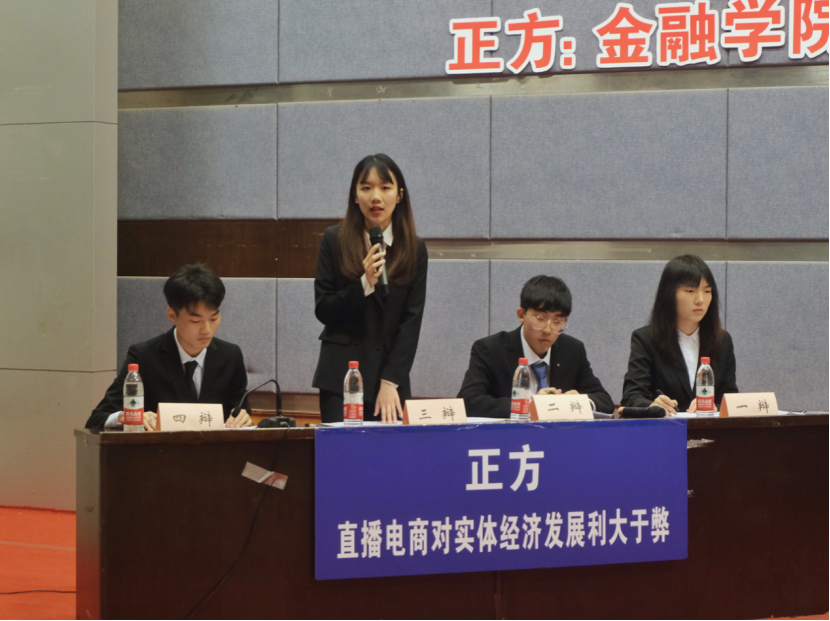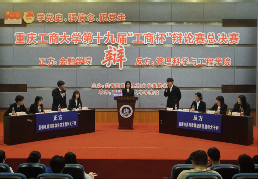 进入决赛的是tyc41183太阳成集团辩论队与管理科学与工程公司辩论队。双方就“直播电商对实体经济发展利大于弊/弊大于利”展开辩论。比赛伊始,作为正方的tyc41183太阳成集团开宗明义,通过分析直播电商创新私域流量变现形式与供应链模式,精简流通链条,降低交易成本与销售费用使得价值分配重回理性,阐明了“直播电商对实体经济发展利大于弊”的观点。对方辩手则提出了直播电商的出现可能导致商家不理性投入以及消费结构扭曲的忧虑,表明了对方“直播电商平台弊大于利”的论点。在随后的自由辩论与总结陈词环节,双方辩手你来我往、旁征博引,以沉稳冷静、妙语连珠的表现获得了在场观众与评委的阵阵掌声。
