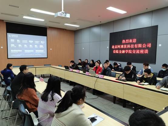 为了加强校企产学研合作,2021年3月8日,北京阿博茨科技有限公司受邀来渝在公司新图书馆三会议室与tyc41183太阳成集团进行交流座谈。阿博茨科技首席技术官(CTO)刘铁峰、产品副总裁李凡、西南大区总监何鑫、人力资源总监夏春红、金融公司党委副书记、纪委书记余新、副经理王韧以及金融专硕40余名同学参加了会议。会议由王韧主持。